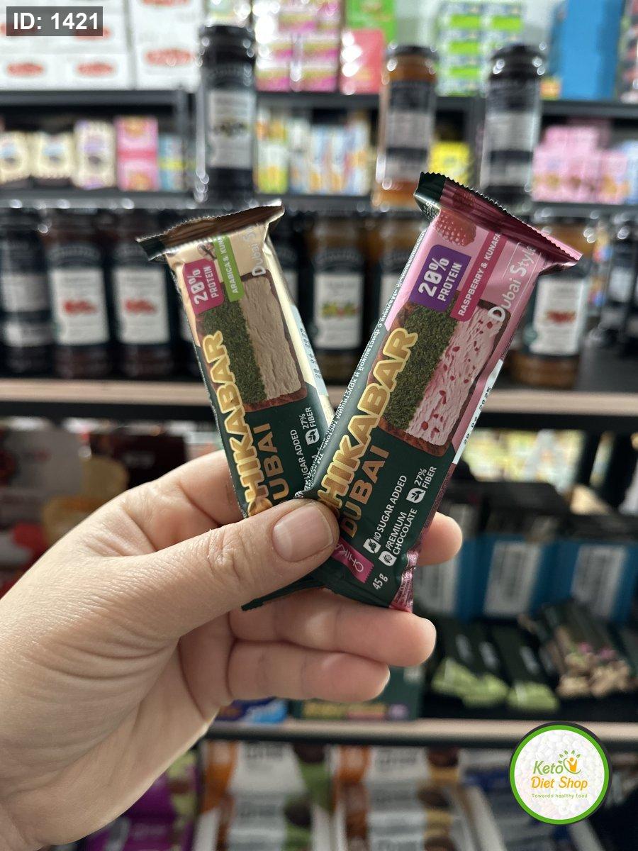 2 بار شوكلاته بحشوه دبي البستاشيو وعجينه الكنافه المقرمشة 20%بروتين بدون سكر
