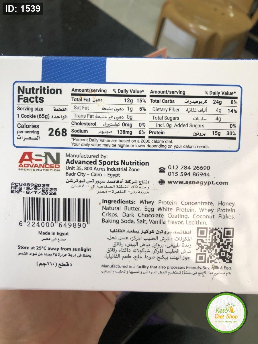 كوكيز 15غم بروتين خالي من الجلوتين خالي من الصويا بدون مواد حافظه بدون سكر 65غم