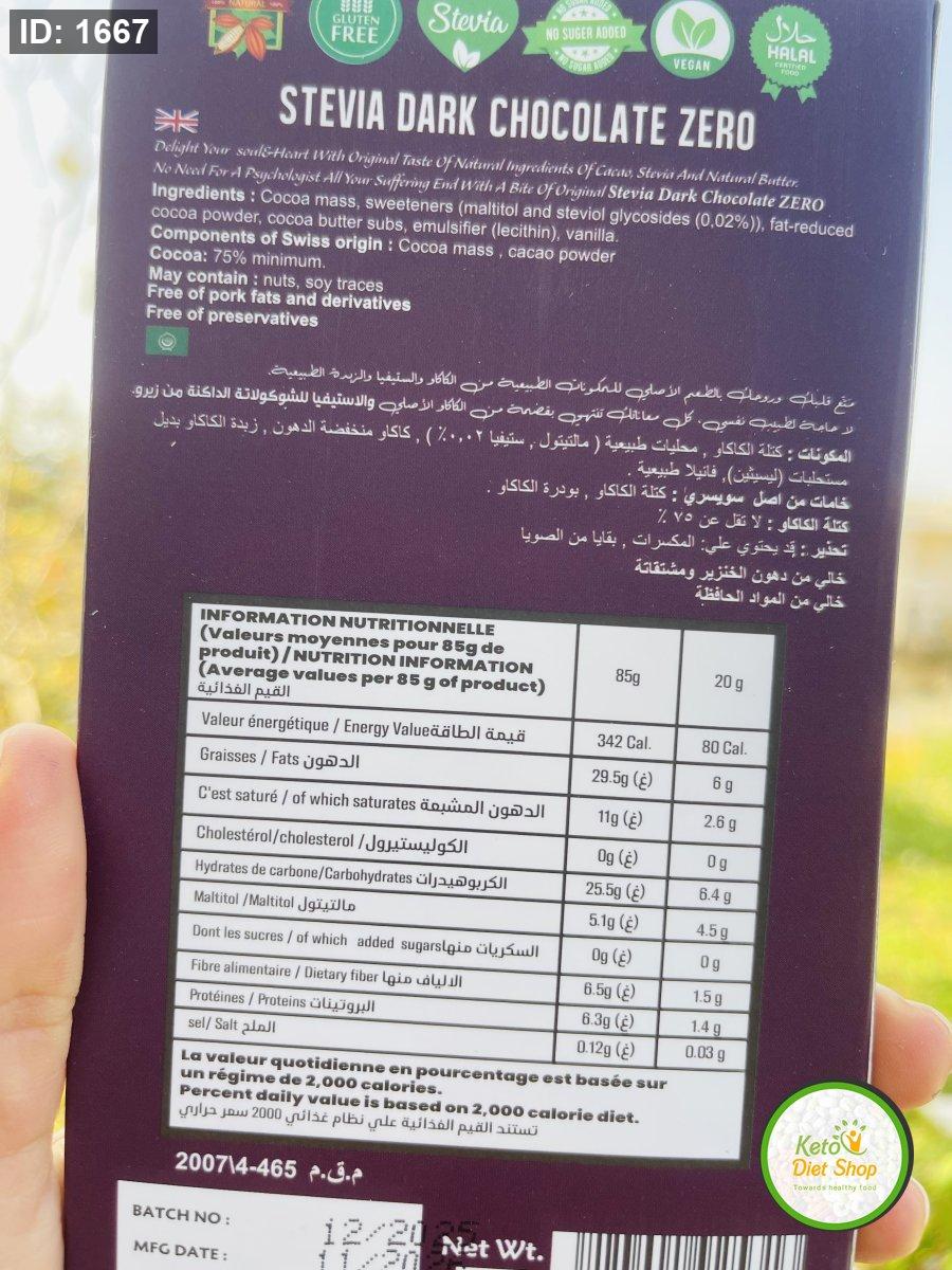 لوح شوكولاته زيرو ساده 75% دارك محلاه بالاستيفيا 85غم