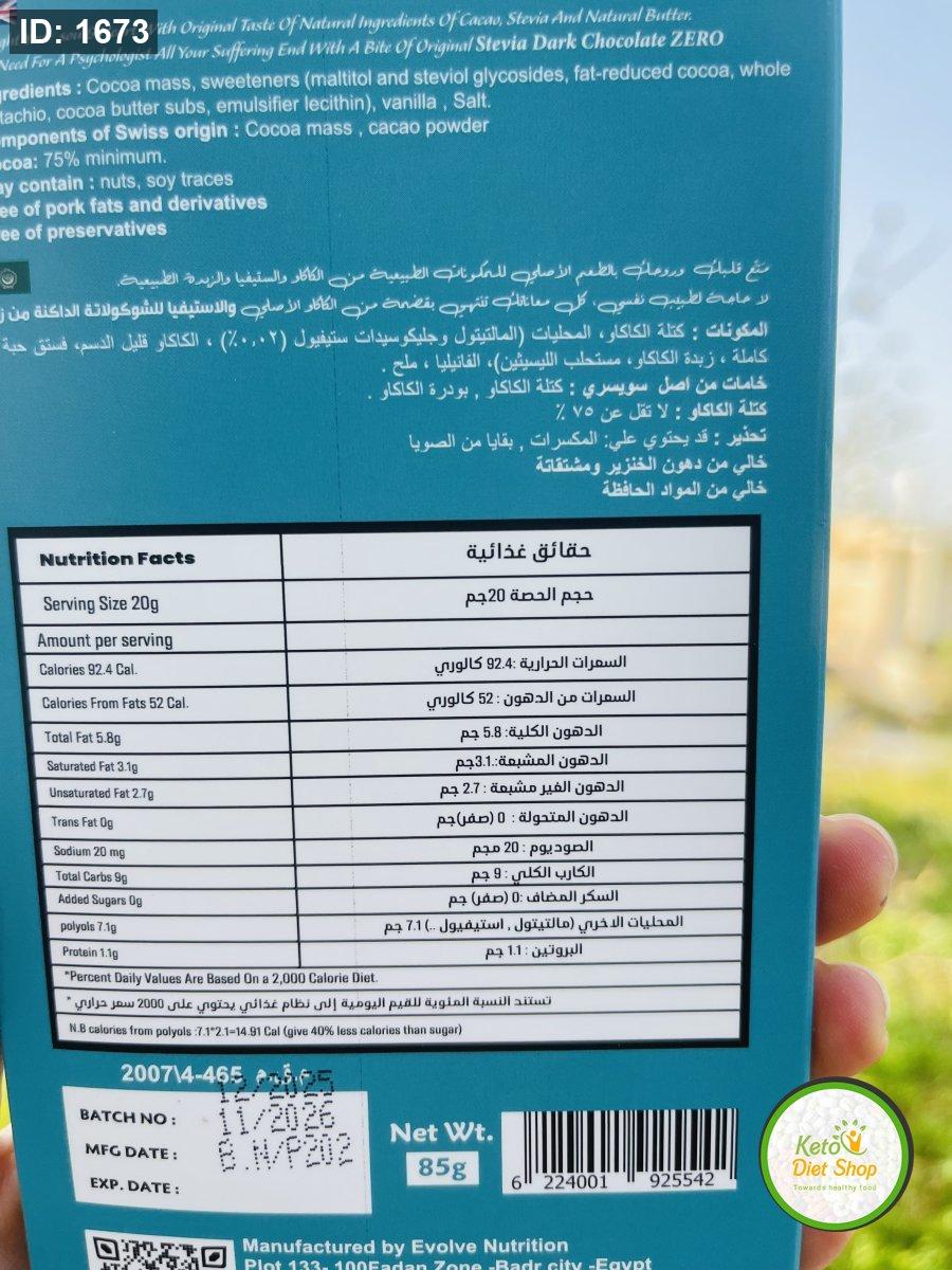لوح شوكولاته زيرو دارك مع قطع البستاشيو محلاه بالاستيفيا 85غم