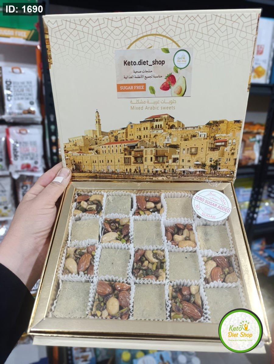 علبه مشكله بلوريه بالفستق الحلبي ودمشقيه مكسرات بدون سكر مضاف 500غم